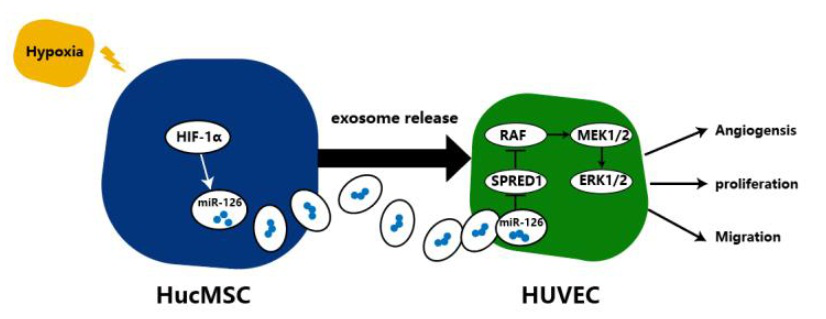 研究人员想了解miR-126是否充当了低氧MSC与HUVEC之间的生物学信使,并可以调节血管生成。通过一系列体外和体内的功能获得和功能丧失分析,他们发现外泌体miR-126的knockdown能够在体外和体内抑制内皮细胞的增殖,表明miR-126在Hypo-Exo介导的血管生成中发挥重要功能。通过进一步的分析,他们确认SPRED1是miR-126的目标基因(图2)。