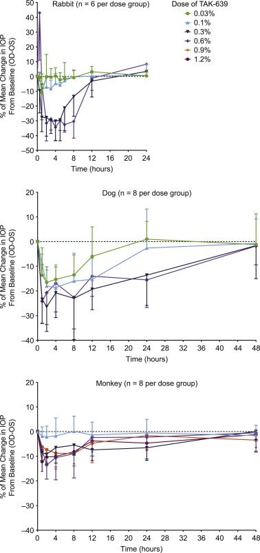 眼压测量和评估:实验评估了单剂量眼用TAK-639后PD对IOP的作用。 TAK-639的浓度范围和研究治疗方案随所测试物种的不同而不同。剂量水平的选择主要是基于先前的研究为每种物种确定了有效剂量水平。兔和犬右眼用0.03%,0.1%,0.3%或0.6%的单剂量TAK-639局部给药,左眼接受溶媒给药。猴仅在右眼接受单剂量的0.03%、0.1%、0.3%、0.6%、0.9%或1.2% 的TAK-639。在对猴的研究中,由于兔和犬的研究证实了溶媒不影响眼压,所以对侧眼不进行药物治疗。通过微量移液管将局部眼部剂量(30或35μL,如适用)施用到角膜的中央或上半部分。给药后,将眼睑张开3到5s,以使药滴散布到整个眼表,然后自然闭合。 然后将每只动物约束约1分钟,以防止眼睛摩擦。所有研究都进行了外部检查,用裂隙灯生物显微镜检查每只眼睛的附件和眼前部。用散瞳剂扩张眼睛,用间接检眼镜检查每只眼睛的眼底。所有眼压测量均由技术人员进行。动物到达后,在预研究之前,动物每周进行三次眼压测量的预处理(训练),至少持续3周(猴每天一次;犬和兔每天至少三次)。在预适应期和研究期间,使用Icare TonoVet眼压计获取每只眼的3个IOP读数(兔,n = 6;犬/猴,n = 8)并取平均值。在研究治疗之前和给药之前以及在给药后的指定时间测量IOP。