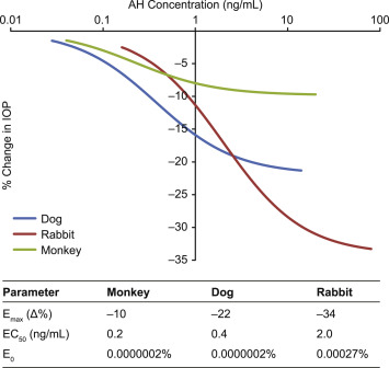 兔,狗和猴的PK / PD曲线比较:估计的IOP降低体内Emax表明,TAK-639在猴和犬中的功效不如兔(分别为−10%和−22%对-34%),但是猴和犬在房水中的暴露在眼压降低一半(EC50)时低于兔子(分别为0.2和0.4 vs.2.0 ng/mL)。TAK-639在房水中的浓度为2 ng/mL时,兔(−17%)和犬(−18%)的最大眼压降低效果相似,但猴(9%)的降低效果更差。在0.3%和0.6%的剂量下,兔房水中TAK-639浓度超过EC50的时间分别为<4和8小时,犬>24小时,猴4小时和10-12小时。