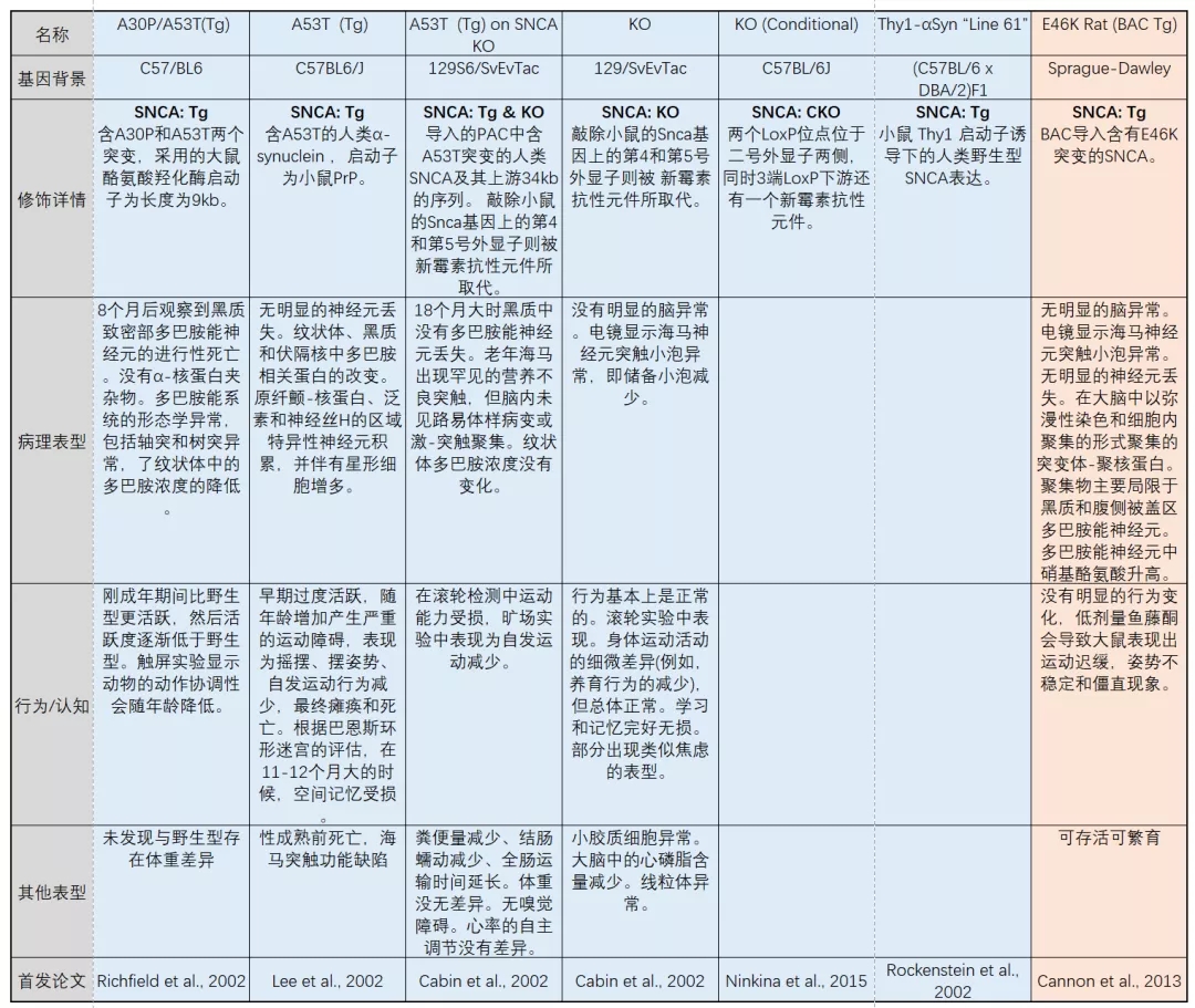 图2. 常用的SNCA动物模型,其中6种为小鼠模型,1种为大鼠模型;5种为转基因模型,2种为KO或CKO模型;转基因模型中有一种是在敲除了小鼠原有Snca基因的基础上得到的。