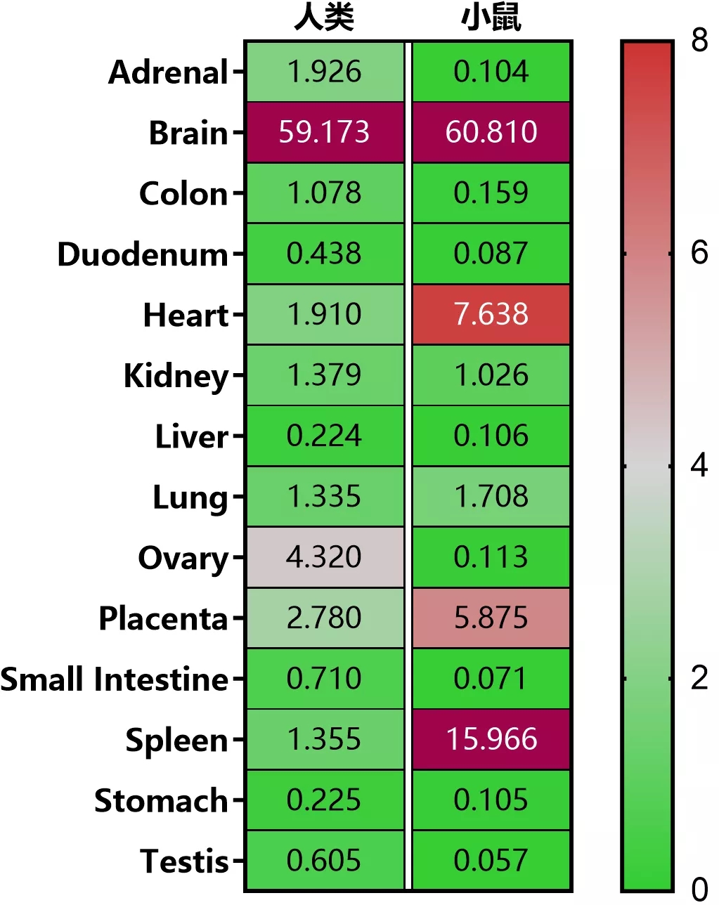 图3. 人和小鼠SNCA基因mRNA相对表达量。在脑组织中该基因的表达明显干预其他组织,在小鼠中表达表达丰度第二的脾脏仅为脑表达的1/4;而人类中表达量第二的卵巢仅为脑表达的1/14,其余器官组织中表达水平较低(同物种内部比较,小鼠和人之间无可比性)。数据来源:NCBI。