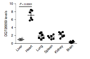 为了系统地研究piRNA的潜在作用并鉴定在心脏肥大中起作用的特定piRNA,研究人员对成年小鼠进行横断主动脉缩窄(TAC)手术,4周后检测左心室样本中piRNA的整体表达情况。研究结果显示表达水平显著变化的piRNAs中有三种和心肌肥大相关,于是研究人员就测试了这三种piRNA在不同组织中的表达水平,发现与其他器官相比,DQ726659在心脏中大量表达,因此,研究人员推测DQ726659在心肌肥大中具有潜在的调节作用,并将这种未表征的piRNA称为与心肌肥大相关的piRNA(CHAPIR)。