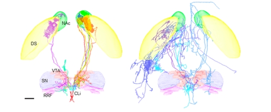 特异性标记:“指哪打哪”在对神经元的研究中,稀疏特异性标记与高亮度成像两者同时实现,一直是难以跨越的“鸿沟”。“特异性选择是为获得我们感兴趣的神经元细胞,它们对某些行为或病理有某些特定的功能,而高亮成像是为了在光学显微镜下更清晰地看到轴突延伸的方向以及长度”,林睿说。为解决这一矛盾,研究人员引入了两个腺相关病毒(AAV),一个名为“控制子(Controller)”,负责控制降低标记细胞的个数;另一个名为“放大子(Amplifier)”,负责增加标记亮度。将两个病毒混合后注射到小鼠脑内感兴趣的细胞上,混合病毒便会侵染神经元,进行特异性标记。通过调整“控制子”和“放大子”的混合比例,控制标记的稀疏程度。利用基于两个腺相关病毒的稀疏标记系统,罗敏敏课题组与华中科技大学国家光电研究中心fMOST课题组合作,借助其荧光显微光学切片断层扫描平台,建立了“细胞特异性稀疏标记—高分辨率全脑形象-神经元形态学重建-量化分析”的流水线,实现稳定高通量的全脑成像和图像分析。在这一流水线上,研究人员在3个DAT-Cre小鼠中重构了15个中脑多巴胺神经元的完整形态。经分析,研究人员认为重构的多巴胺神经元有两种投射模式:其中10个多巴胺神经元轴突只有单个投射目标,它们在终点处会形成小而密集的末端树状分支;另外5个则分布更为广泛,会有多个分支投向不同目标。