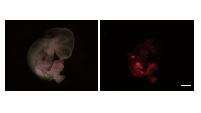 人源细胞嵌合小鼠胚胎在白光(上图)和红色荧光(下图)下的照片。红色荧光指示DsRed标记的人源细胞。