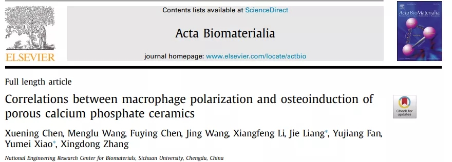 四川大学生物材料工程研究中心的研究团队在Acta Biomaterialia杂志上发表了题为“Correlations between macrophage polarization and osteoinduction of porous calcium phosphate ceramics”的文章,揭示了磷酸钙陶瓷的骨诱导与巨噬细胞极化之间的关联。这些结果不仅加深了人们对骨诱导机制的了解,也有助于设计新型的骨诱导支架。生物材料工程研究中心的肖玉梅和梁洁为共同通讯作者。
