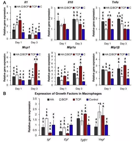 他们还利用RT-qPCR 分析和多重免疫检测定量了炎症相关细胞因子和趋化因子的表达。结果发现,β-TCP明显上调了M1表型标志物的表达,促进巨噬细胞分泌IL-1β、MCP-1、MIP-1α和MIP-1β。相反,BCP上调了M2表型标志物(Arg和Il10)的表达,并增加了CD206+ M2型巨噬细胞的比例。这些结果与体内研究一致,表明β-TCP和BCP分别将巨噬细胞推向M1和M2表型,而HA对巨噬细胞极化没有偏向。