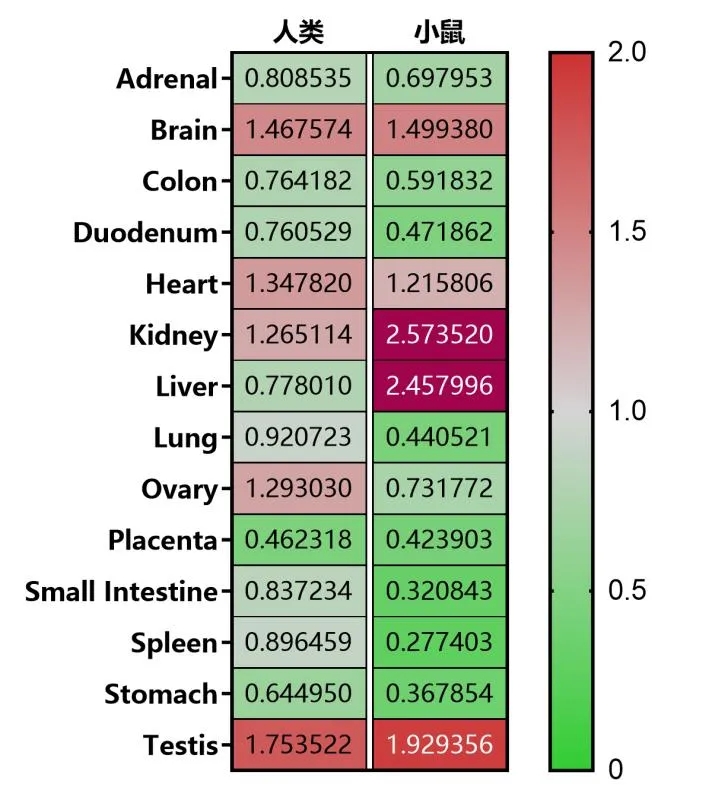 图2. 人和小鼠SIRT3基因mRNA相对表达量,睾丸是表达量最高的器官,大脑、心脏、肾脏也是高表达组织,在睾丸、大脑中高表达;但肝脏和卵巢的表达在人和小鼠的表达却是截然不同的(数据经过归一化处理,同物种内部比较,小鼠和人之间无可比性)。数据来源:NCBI。
