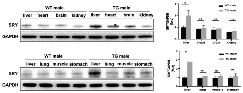 图1. 来自SRY转基因(TG)和野生型(WT)雄性小鼠的主要器官样品中的SRY蛋白水平