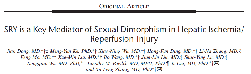 有研究表明,心脏、大脑、肾脏、肠和肝脏对I/R损伤的反应存在性别差异,然而这些基于性别的差异在I/R损伤中确切的分子机制仍然不清楚。近日,西安交大第一附属医院肝胆外科吕毅教授、张谞丰教授团队在外科学顶级期刊Annals of Surgery发表了题为“SRY is a key mediator of sexual dimorphism in hepatic ischemia/reperfusion injury”的文章,揭示了肝I/R损伤基于性别的差异:男性特异性基因SRY在I/R诱导的肝损伤中的作用和机制,论文第一作者为西安交大第一附属医院董健博士、柯梦云副研究员和武晓宁博士,吕毅教授和张谞丰教授为共同通讯作者。