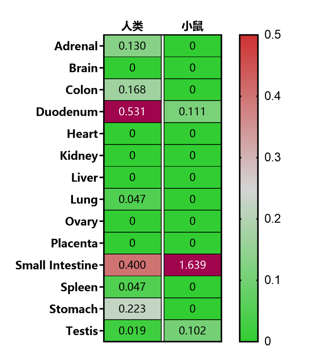 图2. 人和小鼠IL17A基因mRNA相对表达量,小肠是表达量最高的器官,十二指肠的表达在人和小鼠的表达是截然不同的(数据经过归一化处理,同物种内部比较,小鼠和人之间无可比性)。数据来源:NCBI。