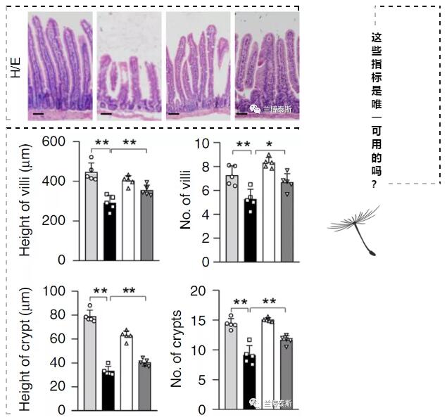 目前,关于肠道的研究如火如荼,在文章或报告中我们经常能看到如下图结果和方法,这就是我们经常用的石蜡切片后进行HE染色,并测量绒毛高度、隐窝深度、以及计算绒毛高度和隐窝深度比,也有测量绒毛或隐窝数量等。这些指标经常用作肠道黏膜屏障功能或反映肠道健康的评价指标,那么这些指标就是唯一可以用的吗?答案当然是否定的。