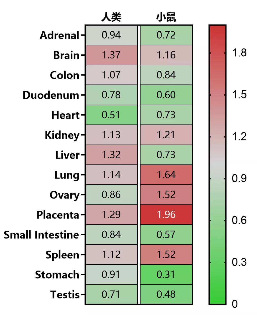 图3. 人和小鼠IFNAR1基因mRNA相对表达量,卵巢、肝脏的表达在人和小鼠的表达差距较大(数据经过归一化处理,同物种内部比较,小鼠和人之间无可比性)。数据来源:NCBI。
