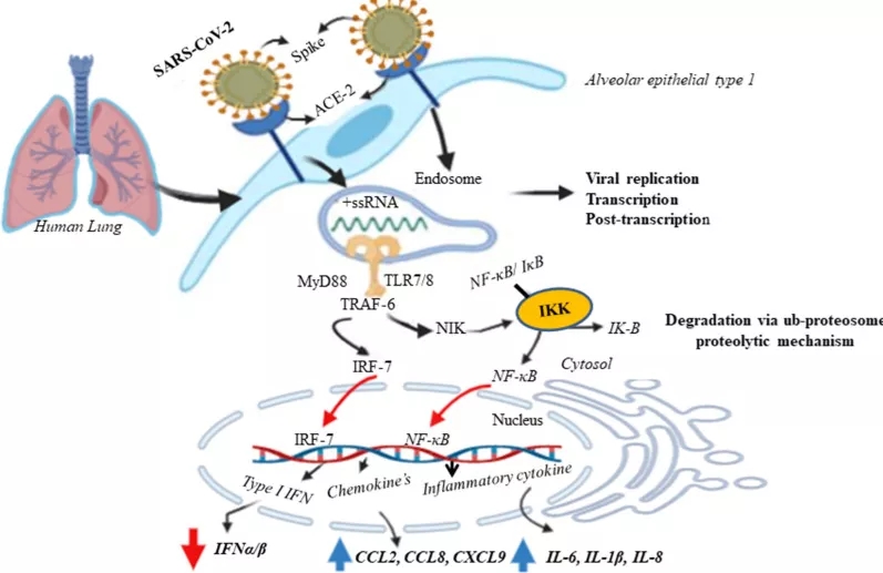 图2. SARS-CoV-2介导的肺泡细胞先天免疫应答的可能机制。SARS-CoV-2通过ACE2受体感染肺泡上皮细胞(主要是I型肺泡上皮)。TLR-7对ssRNA识别,将MyD88募集到受体,该受体分别通过MyD88-TRAF6-NIK-IKK-NF-Kb和MyD88-TRAF-6-IRF-7途径诱导促炎性细胞因子和I型干扰素。上皮细胞的破坏和细胞通透性的增加导致病毒的释放。磷酸化的IRF-7易位至细胞核导致I型IFN基因表达并释放IFNα/β。IkappaB激酶(IKKs)直接磷酸化抑制性的IκB家族成员,该成员通常以非活性形式(NF-κB/IκB)的形式螯合NF-κB。但是,IκB的磷酸化通过泛素蛋白酶体的蛋白水解机制导致其泛素化和降解。NF-κB通路的激活导致包括IL-6、IL-1β、IL-8、CCL2、CCL8和CXCL9在内的肺泡细胞诱导异常炎症细胞因子和趋化因子的分泌。