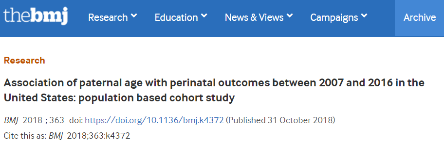 Older fathers associated with increased birth risks, study reportsAssociation of paternal age with perinatal outcomes between 2007 and 2016 in the United States: population based cohort study