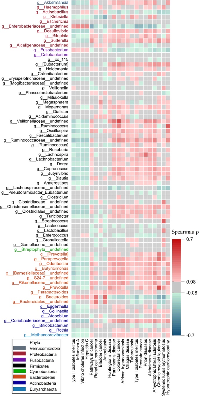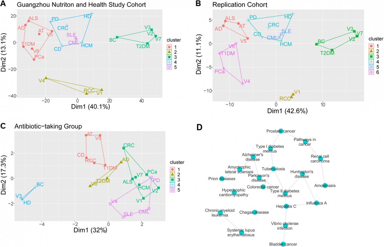 同时发现帕金森与结直肠癌之间、系统性红斑狼疮和慢性粒白血病之间,竟然具有相似的肠道微生物特征,并且这些情况在另一个独立队列中得到了重复发现。这提示我们这些疾病之间可能在病因机制上存在关联。