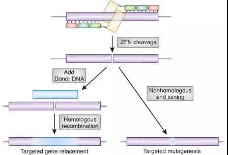 通常基因插入/删除步骤包括(1)基因组的某确定区域双链断裂(DSB),(2)修正缺陷内源基因或引入外源基因,(3)DSB修复。真核生物中的DSB修复有两种内源性修复机制:非同源末端连接(NHEJ)或同源直接修复(HDR)。NHEJ在生物体内发生频率高,但准确性低。为了降低非特异性突变,提高基因编辑保真度,研发人员开发了一种工程核酸酶——锌指核酸酶(ZFN)。