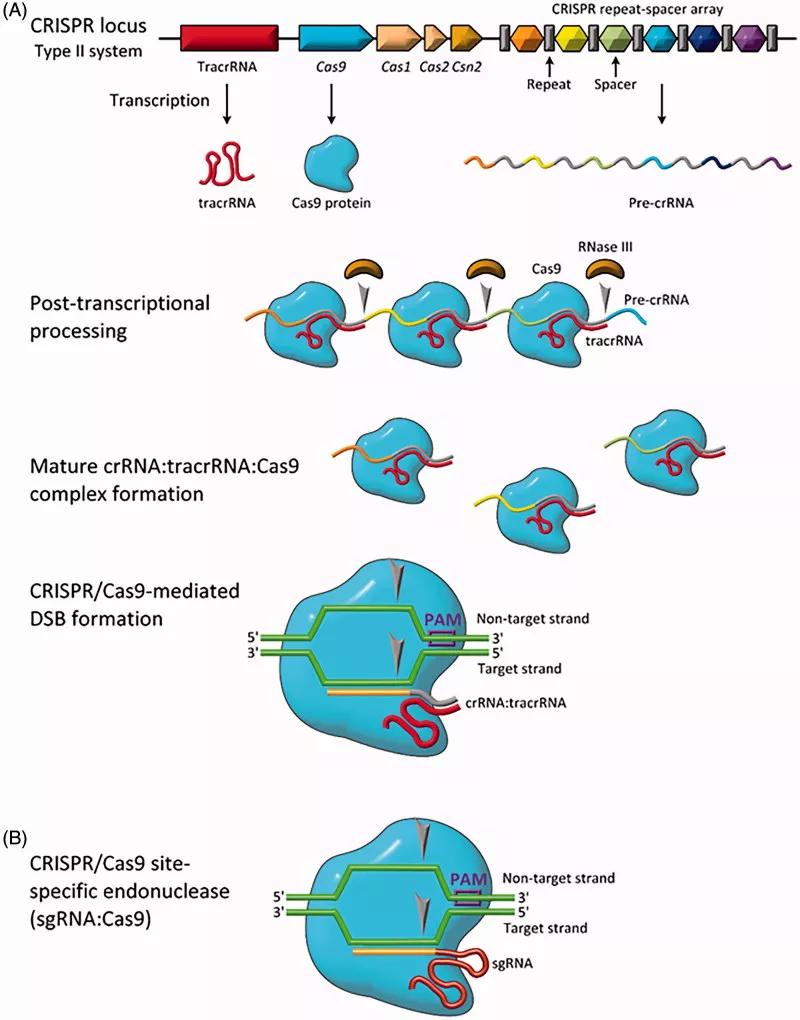 CRISPR基因组由三个部分组成:tracrRNA基因、Cas基因、CRISPR重复序列和间隔区序列。当病毒再次入侵时,这些三部分被转录为tracrRNA,Cas蛋白和pre-crRNA。tracrRNA具有发卡结构,pre-crRNA是由整个CRISPR序列转录而成的大型RNA分子。随后,tracrRNA、pre-crRNA和Cas9形成复合物,并且由RNase III在重复序列处切割将pre-crRNA加工成crRNA,从而形成由crRNA引导的crRNA:tracrRNA:Cas9核酸内切酶复合物。
