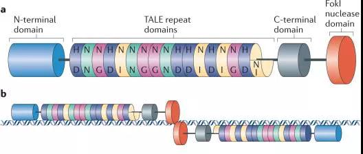 b. TALEN结合并切割为目标DNA位点上的二聚体[2]