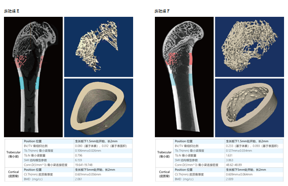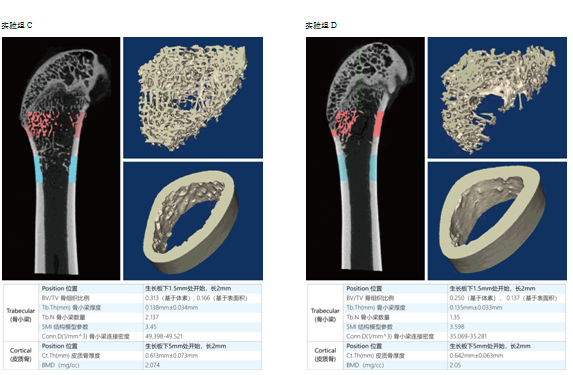 处理方式:选取每个扫描样本(大鼠股骨)的生长板下1.5mm处开始、长2mm区域的骨小梁,以及生长板下5mm处开始、长2mm区域的皮质骨,进行骨参数分析。