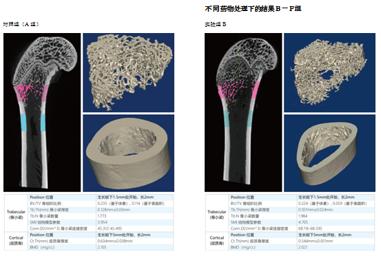 本次实验中,通过Micro CT扫描重建后的图像可以看出不同药物对骨组织量的影响,同时对骨小梁及皮质骨的有关参数进行了定量分析。此实验模式的建立,可有效评价不同药物对骨质疏松的疗效。