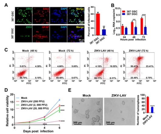 图片说明:寨卡减毒活疫苗特异杀伤胶质瘤干细胞 来源:军事医学研究院胶质母细胞瘤是人类肿瘤中恶性程度最高的肿瘤之一,患者平均生存期只有14个月左右,常规的治疗后患者复发率几乎达到100%。日前,军事科学院军事医学研究院联合国内外多家科研单位协同攻关,成功将寨卡病毒疫苗株开发为新型溶瘤病毒,为胶质母细胞瘤的临床治疗开辟了新的方向。该研究于2018年9月18日在线发表于美国微生物学会权威期刊mBio上。2017年,军事医学研究院秦成峰团队与合作人员共同发现寨卡病毒可以特异地感染和杀伤神经前体细胞和神经干细胞 ,并因此研发了不同类型的寨卡减毒活疫苗。实验表明,该疫苗株颅内注射亦非常安全,不会导致任何神经症状和行为学异常,神经毒力比目前广泛使用的乙脑疫苗还要低。在此基础上,研究人员进一步在细胞水平评估了寨卡疫苗株对胶质瘤干细胞的溶瘤活性。结果发现,寨卡疫苗株可高效感染胶质瘤干细胞,并快速诱导大量细胞死亡,阻止肿瘤球形成。更重要的是,寨卡疫苗株仅对胶质瘤干细胞表现出较高的杀伤效果,对分化后的胶质瘤细胞感染率非常低,能够有效避免“误伤”正常脑细胞。科学家分析,寨卡病毒感染胶质瘤干细胞可以同时激活细胞凋亡相关蛋白、炎症因子、I型干扰素相关基因等多种关键信号分子的表达,这表明寨卡疫苗的抑瘤作用可能是通过不同信号通路协同作用实现的。 - THE END -