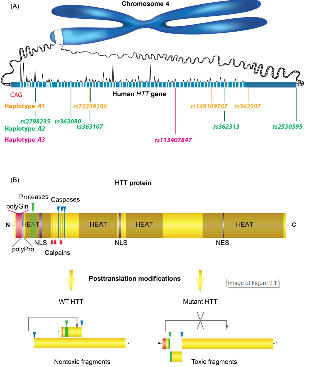 人类HTT蛋白位于4号染色体的短臂上,长达170bp,并具有多达67个外显子。亨廷顿病的致病位点在第一个外显子上。该基因上的突变则多为haplotype A1、A2和A3三种类型。HTT蛋白的重要区域包括N端的多聚谷氨酰胺区域和聚脯氨酸区域;含有氨基酸最多的三个HEAT区域(这个区域最先在四个蛋白中发现)。HTT上有蛋白酶体、Caspase和Calpain的识别位点,正常情况下,HTT能被Caspase水解成两段,而且两段可以自行结合行使功能;而在HD病理情况下,HTT的表达不但增加了,而且其游离的N端产物更易聚集,同时C端也会产生一定的毒性。