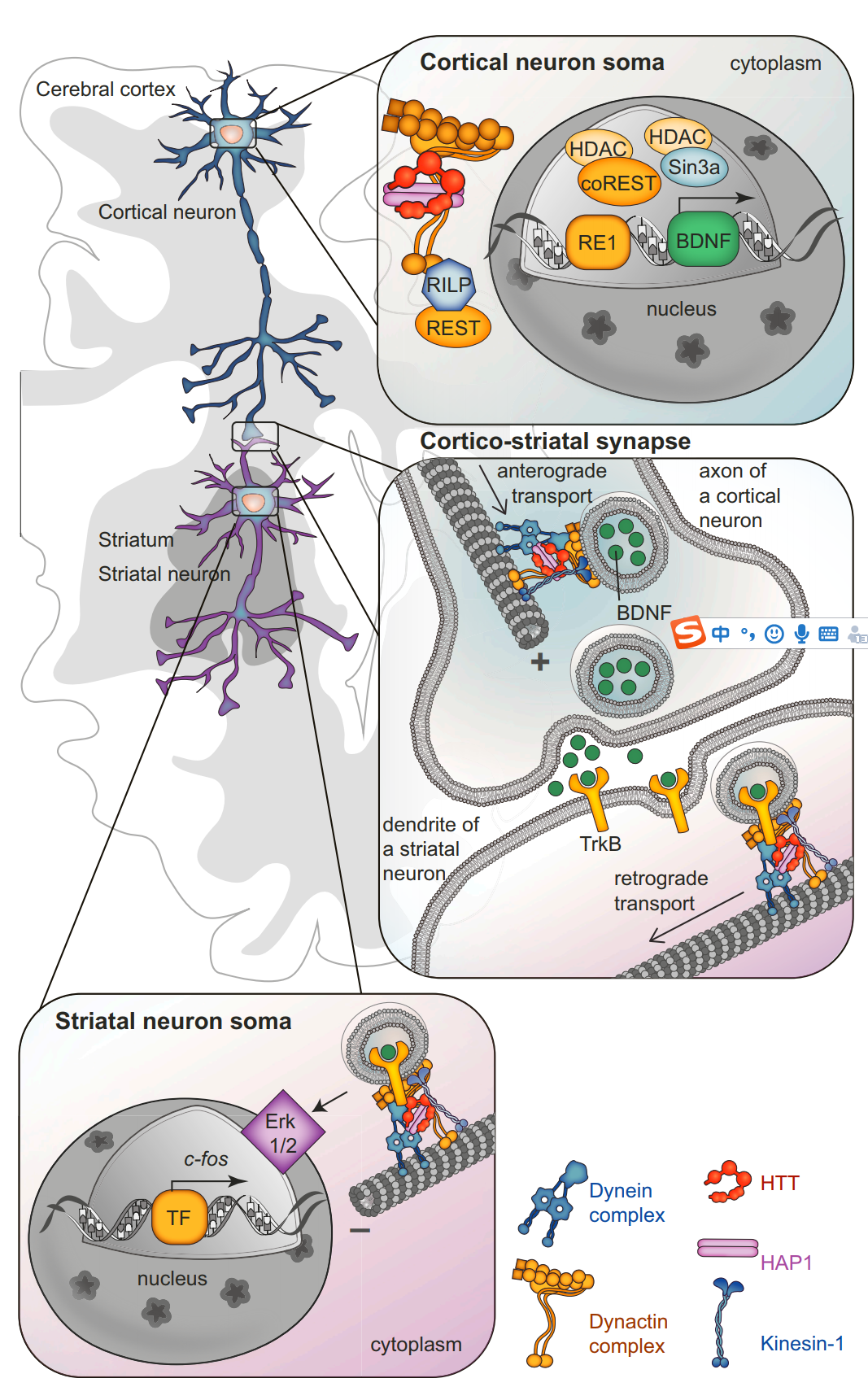 正常的HTT能促进BDNF的转录并促进皮层-纹状体轴突中的BDNF进行转运。当BDNF释放进入皮层-纹状体之间的突触时,就会激活纹状体上的TrkB受体,造成TrkB的内吞,内吞的TrkB与Dynein、Dynactin以及Kinesin-1共同构成复合体激活Erk1/2,促进神经元的存活。