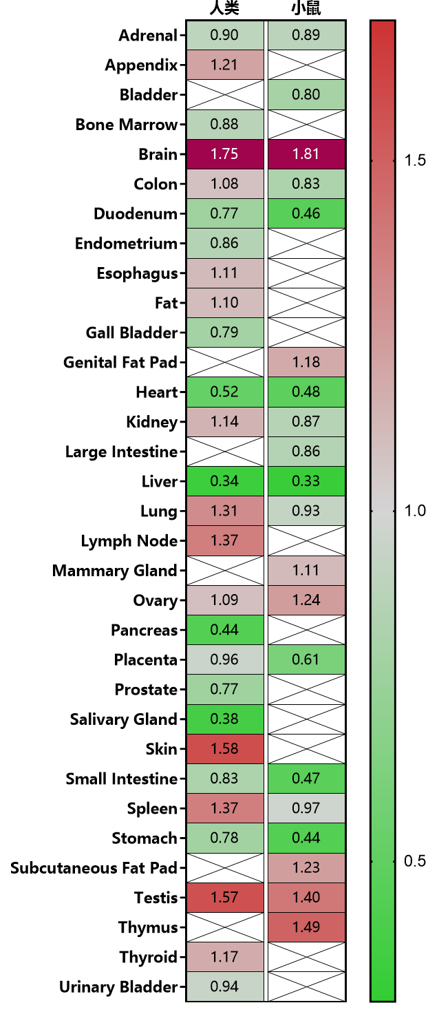 图3. 人和小鼠HTT基因mRNA相对表达量。人和小鼠脑组织中该基因无疑都是绝对的高水平表达。接下来就是睾丸、皮肤、脾脏和肺中该基因表达也较高。小鼠在胸腺中的表达也很高不(表达信息为归一化的相对值,而非直接RPKM数据;同物种内部比较,小鼠和人之间无可比性)。信息来源:NCBI。