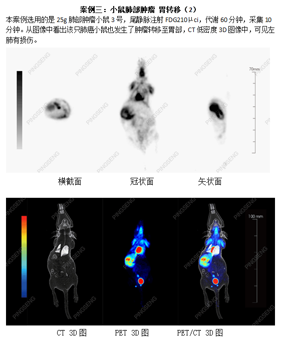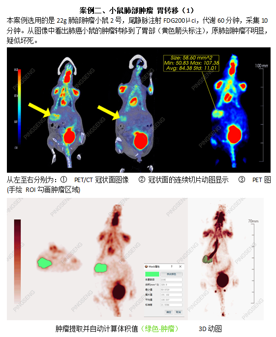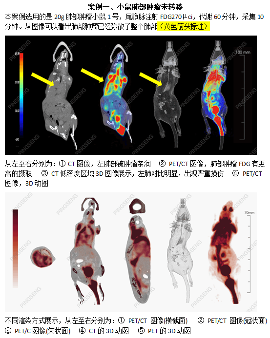 肿瘤学是小动物PET/CT分子影像技术的应用热点之一,主要在评估肿瘤模型的建立、进行肿瘤模型筛选、肿瘤检测及药效评价方面发挥着重要作用。肺癌是呼吸系统中最常见的一种恶性肿瘤。当肿瘤细胞从原发部位,经淋巴道,血管或体腔等途径,到达其他部位继续生长时即发生了肿瘤的转移。