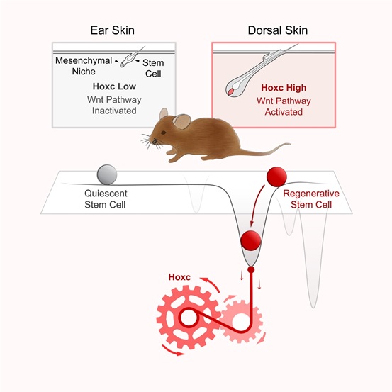 来自NIBS的研究人员发表了题为“Hoxc-dependent mesenchymal niche heterogeneity drives regional hair follicle regeneration”的研究论文。该论文发现在小鼠身体不同部位的皮肤中,Hoxc在干细胞微环境中的差异性表达引起下游Wnt信号通路的激活的差别,从而引起毛囊干细胞再生的位置性差异,揭示了干细胞微环境在身体水平的异质性与可塑性如何影响干细胞再生能力的分子机制。这一研究成果公布在8月16日的Cell Stem Cell杂志上,文章的通讯作者为NIBS的陈婷博士和王凤超博士,第一作者为于宙。