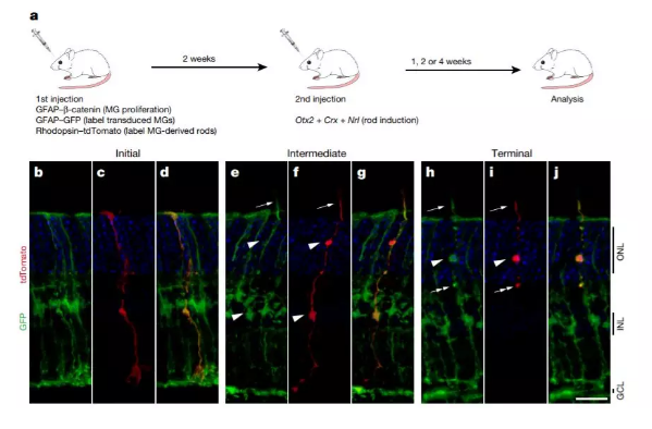 两步技术在这项新研究中,他和他的同事采取了不同的方法,他们在野生型小鼠,和先天性失明模型的两种小鼠中将Müller神经胶质细胞重新编程为未受损伤小鼠视网膜中的视杆细胞。研究团队开发了一个两步技术,首先向四周龄小鼠的视网膜中注射一种腺相关病毒,能激活β-catenin蛋白(一种帮助胶质细胞重新进入细胞周期的蛋白质)。两周后,小鼠接受第二次注射,其中包含表达转录因子Otx2,Crx和Nr1的基因。在过去的研究中显示,这些基因能帮助视杆感受器的发育。随着基因治疗的展开,Müller神经胶质细胞被标记上化学标签:EdU和BrdU,监测细胞分裂,结果显示大多数神经胶质细胞在Ctnnb1基因转移后经历了一轮细胞分裂,表达了β-catenin。标记分化为视杆细胞的视紫红质-tdTomato标签显示,在第二次注射后,当Müller神经胶质细胞分裂时,一个子细胞变成杆状光感受器,而另一个保留为Müller神经胶质细胞。新产生的视杆细胞能表达光敏视网膜细胞的蛋白质特征。为了测试新形成的视杆细胞是否检测到光,研究小组检查了缺乏GNAT1的小鼠,GNAT1是光转导的重要组成部分。获得基因治疗的突变小鼠视网膜中视网膜神经节细胞的光反应显示,一些细胞有反应,而未接受治疗的突变小鼠中没有任何变化。研究人员团队还检测到处理过的突变小鼠大脑的初级视觉皮层中的光反应,但在未治疗的小鼠的同一脑区中未检测到同样的反应。带来深刻的影响“这是一篇令人兴奋的论文,因为许多实验室一直试图将哺乳动物中的Müller胶质细胞重新编程,”美国国家眼科研究所的神经生物学家Anand Swaroop(未参与这项研究)说,“它提出了哺乳动物中Müller胶质细胞可以重新编程的原理证据。”东京大学的分子和发育生物学家Sumiko Watanabe(未参与这项研究)也认为这篇论文令人印象深刻,指出它将对该领域产生巨大影响。不过,她和Swaroop都指出,将这种类型的基因疗法转移到临床治疗人类可能需要一些时间,因为需要回答更多关于该技术如何替代受损视杆细胞的问题。Swaroop指出,很少有Müller神经胶质存在于视网膜中,所以如果这些神经胶质只经历一个细胞分裂来制造一个感光器,那么就不会产生很多视杆光感受器,可能还不足以逆转变性。此外,该研究没有解决受损视网膜中的Müller胶质细胞是否会分化成视杆光感受器或保持神经胶质细胞这个问题。“还有很多东西需要用这种技术进行测试和调整,”他说。陈博士认为他的团队将要解决的首要问题之一就是先天性失明的小鼠在治疗后看到的情况。 “我们知道它们恢复了视觉,但我们不确定它们看到了多少,”他解释道。该团队还计划检测两步基因转移方法是否适用于人类视网膜,但是解剖人类视网膜组织很困难,所以这些研究可能更具挑战性。iPS移植恢复视力以往的一些研究证实,可以在实验室中用多能干细胞生成构成视网膜或角膜的一些特殊细胞类型,但这些研究无法描绘出整个眼睛发育的完整性。日本的科学家利用人类的诱导多能干细胞生成了眼睛的多个细胞谱系,包括晶状体、角膜和结膜。科学家们证实,可以培育角膜上皮细胞,并将之移植到实验诱导失明的兔子眼睛上,手术修复眼睛的前部。另外一项研究则是研发出了一种外科手术策略,可以激活体内自身的干细胞在先天白内障婴幼儿的眼睛中再生出透明的功能性晶状体。原文标题:K. Yao et al. “Restoration of vision after de novo genesis of rod photoreceptors in mammalian retinas,” Nature, 10.1038/s41586-018-0425-3, 2018.