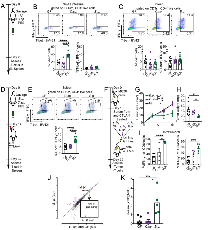 图2. B. pseudolongum和ICB处理对Th1细胞表型的影响及促进免疫疗效的代谢物肌苷的鉴定