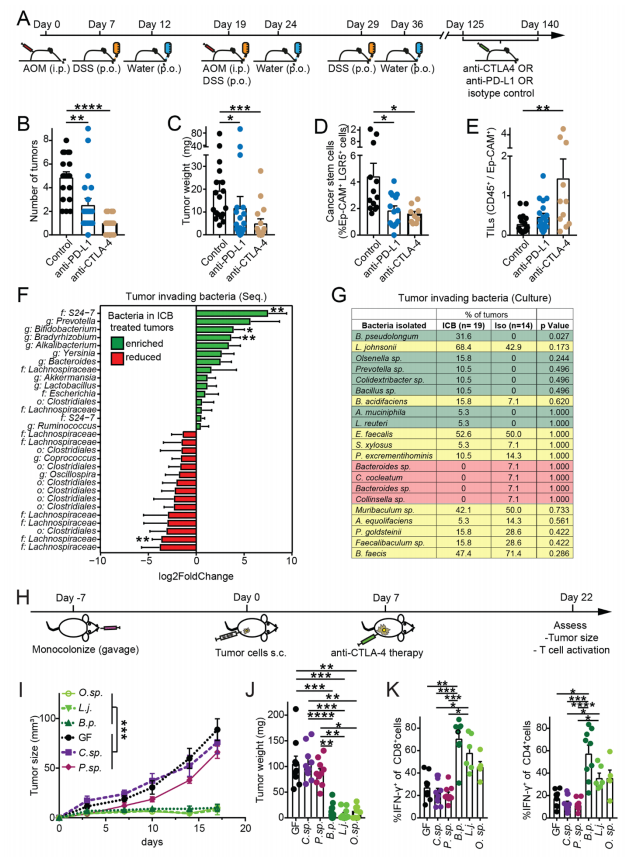 研究人员首先在偶氮甲烷(AOM)/葡聚糖硫酸钠(DSS)诱导的结直肠癌(colorectal cancer,CRC)小鼠模型上寻找与ICB疗效相关的菌群;然后在皮下接种了MC38(小鼠结直肠癌细胞系)的无菌小鼠模型中筛选可显著提高ICB疗效的肠道菌群(使用无菌小鼠模型可控制菌群种类变量),并研究潜在的分子机制;最后在多种不同类型的肿瘤小鼠模型上进行了验证。