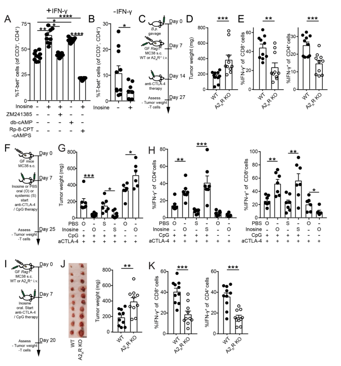 特别地,肌苷能与腺苷2A受体(A2AR)结合。在一些报道中显示,它们的结合在体外实验中对Th1分化有抑制作用;在体内实验中对抗肿瘤免疫有抑制作用。但也有小部分研究表明肌苷类似物有促炎反应,A2AR信号可以维持Th1在小鼠体内的抗肿瘤免疫作用。基于这些“矛盾”的报道,研究人员探究发现,肌苷对Th1的作用是由环境决定的:在有外源IFN-γ存在的情况下,肌苷促进初始T细胞分化为Th1;当IFN-γ不存在时,肌苷抑制Th1的分化。接下来,研究人员探究了肌苷促Th1分化的分子机制。结果显示:当A2AR信号被阻断时,肌苷的促Th1分化作用失效;加入cAMP(A2AR的下游信号分子)后,肌苷的促Th1分化作用恢复;而阻断蛋白激酶A(cAMP的下游信号分子)后,肌苷的促Th1分化作用失效。此外,inosine-A2AR-cAMP-PKA信号通路能导致cAMP反应元件结合蛋白(cAMP response element-binding protein,CREB)的磷酸化,而CREB是已知的Th1关键分化因子(e.g. IL-12R和IFN-γ)的转录增强子。随后,研究人员探究了T细胞表面A2AR在B. pseudolongum增强ICB疗效中的必要性。结果显示A2AR的缺失会降低B. pseudolongum对ICB疗效的增强效果。