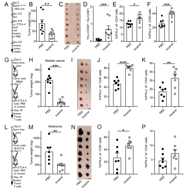 由于在多数肿瘤免疫反应中,Th1一般被认为起到抗肿瘤免疫作用,因此研究人员决定在其他肿瘤小鼠模型上验证肌苷联合共刺激信号是否能够增强ICB疗效。实验结果表明:使SPF级Msh2LoxP/LoxPVillin-Cre小鼠(自发小肠腺癌)口服肌苷,并给予CTLA-4抗体和CpG共刺激,小鼠体内肿瘤重量明显下降,脾脏内IFN-γ+CD4+ 和 IFN-γ+CD8+ T细胞数量显著升高;在膀胱癌和黑色素瘤小鼠模型上也能观察到类似结果。