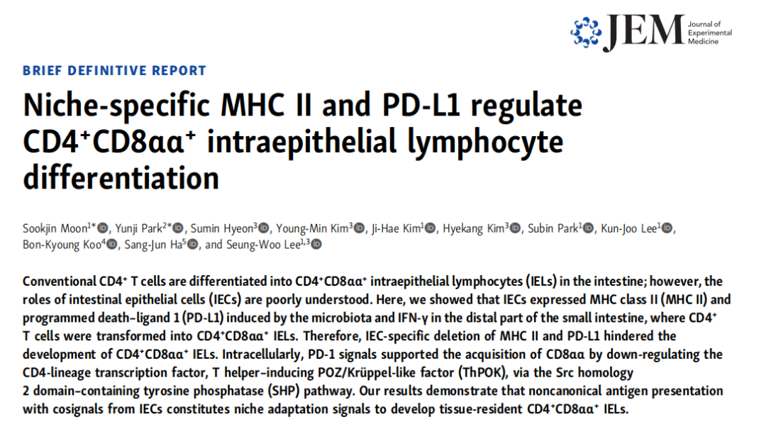 小肠中,经典CD4+ T细胞可分化为CD4+ CD8αα+上皮内淋巴细胞(intraepithelial lymphocytes, IELs),但是它们周围的小肠上皮细胞(intestinal epithelial cells,IECs)在其中的作用还不明确。近日,Dr. Moon带领的韩国团队研究发现:在小肠远端,IECs在微生物群和IFN-γ的刺激下能通过表达MHC II类分子和程序性死亡配体-1(programmed death ligand-1,PD-L1),提供生态龛(niche)适应信号,来促进CD4+CD8αα+IELs(DP IELs)的分化。 这一研究结果发表在了Journal of Experimental Medicine杂志上[1]。