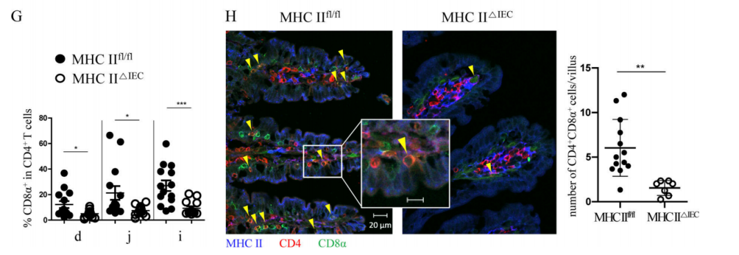 图1G-H. 流式(G)和免疫荧光实验(H)都显示:与MHC IIfl/fl对照组小鼠相比,MHC II△IEC小鼠的DP IELs在SP IELs细胞中的比例显著下降。此外,免疫荧光实验(H)显示,大部分DP IELs都与高表达MHC II的上皮细胞的基底外侧面相接触。