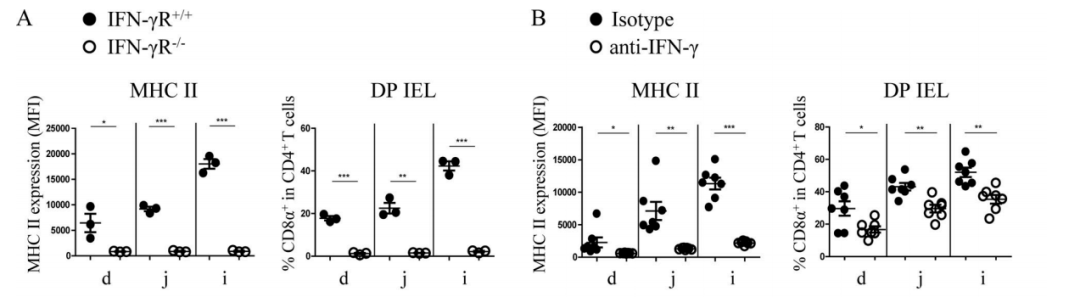 有报道显示IFN-γ在非造血细胞(例如IECs)中能强效诱导MHC II的表达。为了进一步验证这个结论,研究者们使用了一款IFN-γ受体敲除小鼠(IFN-γR−/−)。与前人的实验结论一致:在IFN-γR−/−小鼠的IECs上,未检测到MHC II的表达,而且DP IELs分化严重受阻,其在SP T细胞中的比例几乎为0(图2A);在野生型小鼠中,加入anti-IFN-γ抗体后,MHC II的表达水平以及DP在SP IELs细胞中的比例都显著降低(图2B)。此外,有报道显示IFN-γ是DP IELs分化所必需的:它能通过诱导转录因子T-bet的表达,促进DP IELs的分化。这说明IFN-γ在DP IELs的功能成熟中起到了重要作用。