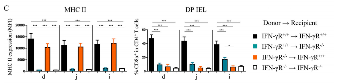 为了探究IELs和IECs中,IFN-γ对DP IELs分化的影响,研究者们构建了骨髓(Bone marrow,BM)嵌合体小鼠:从供体小鼠的腿骨中取得BM细胞,静脉注射到经致死剂量辐照后的受体小鼠体内(供体小鼠的造血细胞→受体小鼠),8周造血重建期过后处死受体小鼠。结果显示(图2C):无论是在造血细胞(例如CD4+IELs),还是非造血细胞(例如IECs)中,DP IELs的分化都需要完整的IFN-γR信号。此外,之前在野生型小鼠中观察到的不同小肠部位中MHC II表达量和DP IELs比例的明显差异,在BM嵌合型小鼠中都未能观测到。研究者们推测这有可能是因为免疫重建后的受体小鼠比稳态时产生了更多的IFN-γ,而这改变了肠道微环境,使其炎症化,因此消除了这种区域性差异。