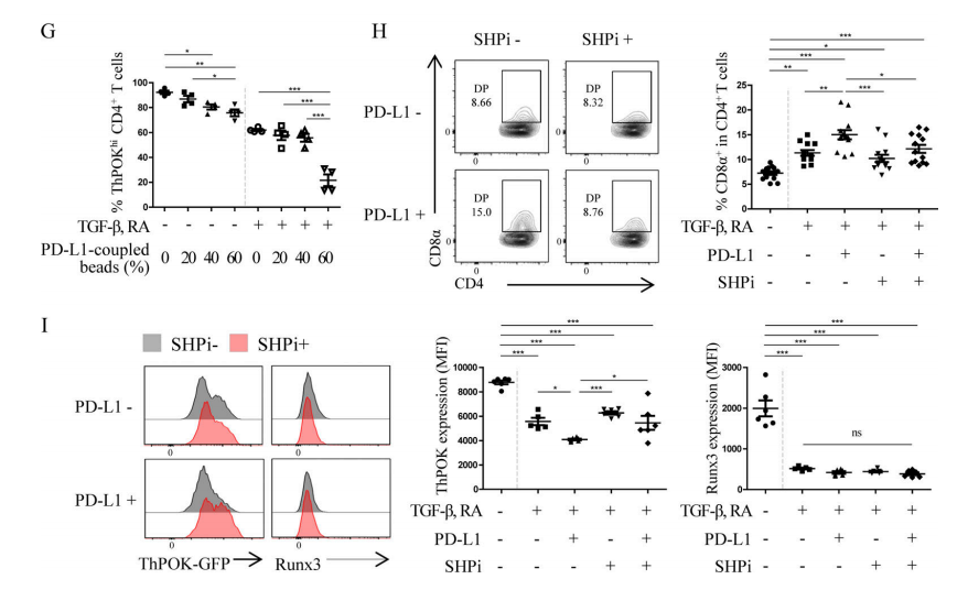 图5G-I. (G)将CD4+ T细胞和TGF-β、RA、PD-L1体外共培养3天后,测定ThPOKhi细胞比例。PD-L1介导了ThPOK的表达下调;(I-H) 将CD4+ T细胞和TGF-β、RA、PD-L1、SHP抑制剂(SHPi)体外共培养3天后,测定DP IELs的比例以及ThPOK和Runx3的表达水平。