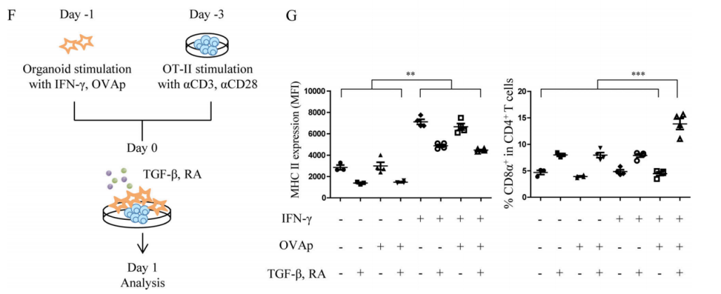 为了直接探究MHC II+IECs是否在DP IELs分化中起到了非典型APC的作用,研究者们构建了分别来源于IFN-γR+/+小鼠和IFN-γR−/−小鼠的小肠类器官(orgnoids)。他们首先验证了IFN-γ在类器官中能发挥与体内一致的效果:IFN-γ能强效诱导类器官中IECs上MHC II的表达(图2D-E)。此外,有研究显示,T-box expressed in T cells (T-bet)是DP IELs分化过程中的重要上游调控因子,它能诱导Runx3的表达并抑制ThPOK 的表达;而T-bet诱导产生的细胞因子(例如IFN-γ)在肠道微环境刺激因子的存在下,能进一步促进DP IELs的分化。因此,研究者们在肠道微环境刺激因子TGF-β和视黄酸(Retinoic acid,RA)存在的情况下,将经IFN-γ和卵清白蛋白多肽(ovalbumin peptide,OVAp)预刺激后的小肠类器官,以及经anti-CD3ε/CD28预刺激后的OVA特异性CD4+ T细胞(OT-II)进行24h共培养(图2F)。结果显示:IFN-γ能诱导MHC II大量表达;MHC II+IECs在DP IELs分化中起到了非典型APC的作用,且TGF-β和RA刺激能进一步促进DP IELs的分化。