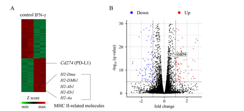 图3A-B. 差异表达基因热图(A)和火山图(B)。