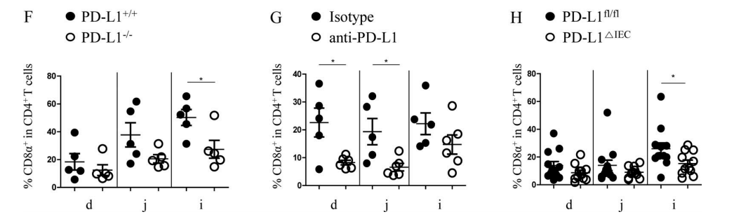 图3F-H. (F)与PD-L1+/+小鼠对比,在PD-L1−/−小鼠回肠中,DP IELs比例明显下降;(G)将脾CD4+ T细胞输入到RAG-1−/−小鼠体内后,在小鼠体内加入anti-PD-L1抗体,DP IELs发育受阻;(H)与PD-L1fl/fl小鼠对比,在PD-L1△IEC小鼠回肠中,DP IELs比例明显下降。