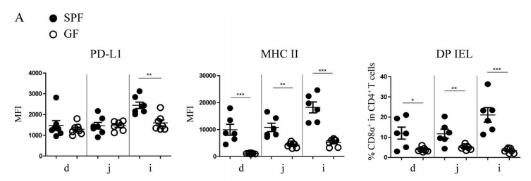 图4A. 与SPF小鼠对比,GF小鼠IECs上PD-L1的表达水平在回肠中显著降低、MHC II表达量和DP IELs比例在小肠各部位显著下降,特别是在回肠中。