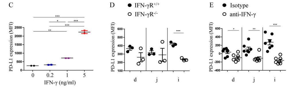 图3C-E. (C)经不同浓度IFN-γ处理后,小肠类器官PD-L1的表达量;(D)与IFN-γR+/+小鼠对比,IFN-γR−/−小鼠中的PD-L1表达量显著降低;(E) 在IFN-γR+/+小鼠体内注射anti-IFN-γ抗体后,IECs上PD-L1的表达量显著降低。
