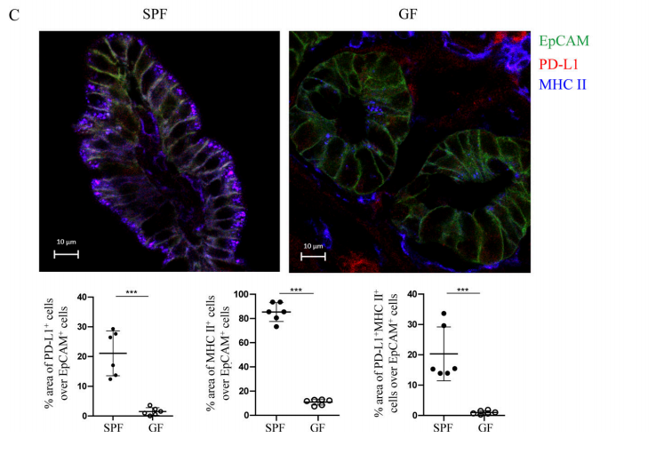 图4C. 免疫荧光实验显示:SPF小鼠回肠中的IECs大多数都表达MHC II,20%表达PD-L1;而GF小鼠中,MHC II和PD-L1的表达量都显著降低。