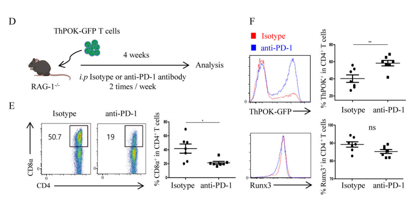 图5D-F. (D)实验示意图:将来源于ThPOK-GFP报告小鼠的脾脏T细胞移植到RAG-1−/−受体小鼠体内,并在重建期对受体小鼠进行anti-PD-1抗体处理;(E)ThPOK和Runx3的表达水平;(F)DP IELs的比例。
