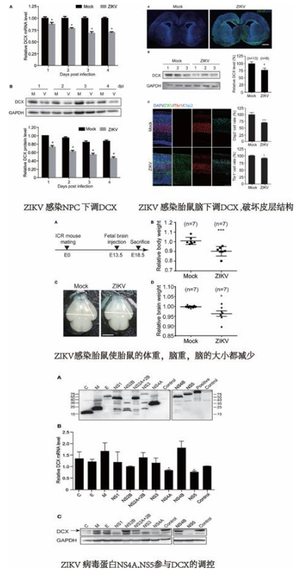 近日,中国科学院武汉病毒研究所罗敏华课题组在寨卡病毒(ZIKV)致神经损伤机制研究方面取得新进展,发现寨卡病毒感染神经干细胞时显著下调其重要标志分子双皮质素(doublecortin,DCX),为寨卡病毒感染影响脑皮层结构和大脑神经发育提出新的潜在机制。该工作在线发表于 Frontiers in Micorbiology。寨卡病毒(Zika virus,ZIKV),是黄病毒科中之黄病毒属,经由埃及斑蚊传播,该病毒最早在 1947 年于乌干达的寨卡森林中的猕猴体内分离出来,因而得名。近两年,寨卡病毒爆发于中南美洲和东南亚地区,并导致该地区小头畸形(microcephaly)和其他出生缺陷率显著升高,引起全球关注。已有报道显示人神经干细胞(neural progenitor cell,NPC)能够被寨卡病毒感染,提示其导致小头畸形可能是通过影响神经干细胞的细胞命运而导致的,而其分子机制尚未解析。该研究通过对寨卡病毒感染人原代 NPC 进行蛋白质组学分析,发现细胞内影响神经祖细胞增殖、分化、迁移的重要标志分子的蛋白水平都有所改变。而其中双皮质素(DCX)在 NPC 的分化、迁移中起着重要作用。结果显示,寨卡病毒感染 NPC 时,能同时下调 DCX 的蛋白质水平及 mRNA 水平。而在寨卡病毒感染胎鼠脑模型中,DCX 的蛋白水平也有明显下调,且伴随着胎鼠体重、胎脑重和胎脑大小的异常及脑皮质结构的破坏。通过进一步筛查寨卡病毒蛋白,并使其 NPC 中逐一表达,结果发现 NS4A 和 NS5 与 DCX 蛋白水平和 mRNA 水平的下调存在相关性。这些数据说明寨卡病毒对 DCX 的调节是发生于感染之后,而病毒蛋白 NS4A,NS5 参与 DCX 的调控。该研究工作揭示了寨卡病毒与 NPC 细胞命运及胎脑发育异常之间的联系,指出了关键分子 DCX 在皮层感染病理结果中发挥的重要作用。同时,筛选到病毒蛋白 NS4A,NS5 下调关键分子 DCX,进一步揭示了寨卡病毒影响胎脑发育的分子机制。后续将继续确认是病毒蛋白与 DCX 相互作用的机制。武汉病毒所神经病毒学科组博士后姜旋为第一作者,罗敏华和广州妇女儿童医疗中心教授唐亚平为共同通讯作者,该工作获得国家自然科学基金、国家重点实验室和广州妇女儿童医疗中心的合作与支持。