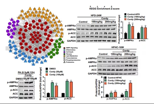 为进一步探究虫草素对NASH的保护机制,对细胞和小鼠的RNA-Seq结果进行了通路富集,发现差异基因均主要集中在脂代谢、炎症、纤维化和凋亡途径,其中虫草素对AMPK通路的影响优于其他信号通路。通过多组学(转录组学、蛋白质组学和磷酸化蛋白质组学)分析表明,AMPK通路与脂代谢、炎症、纤维化和凋亡靶点显著相关,可能是虫草素作用的关建通路。为确定虫草素抗NASH是否通过AMPK途径,研究者测定了细胞中、HFD和HFHC分别诱导的小鼠肝脏中AMPK通路中蛋白的表达,发现虫草素显著激活了AMPK及其下游ACC蛋白的磷酸化。