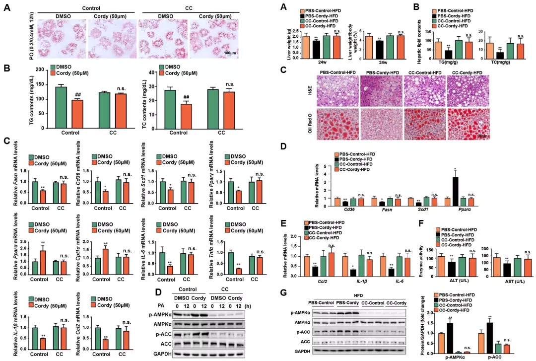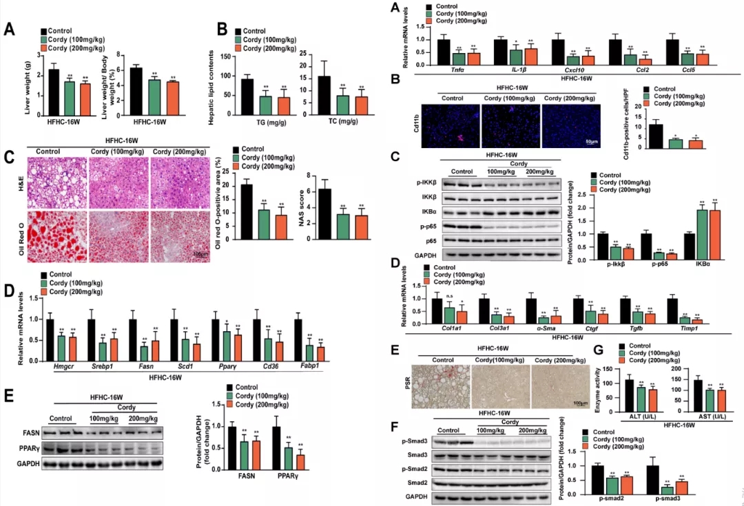 探究虫草素能否减轻HFD引起的小鼠NASH疾病(雄性C57BL/6J小鼠HFD喂养共24周)。实验结果表明,虫草素显著降低了HFD引起的肝指数升高、肝脏脂质(TG、TC)含量增加、肝脏病理损伤(脂质蓄积、气球样变、炎性浸润)、脂肪酸合成摄取和炎症反应相关基因和蛋白的表达。